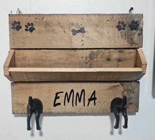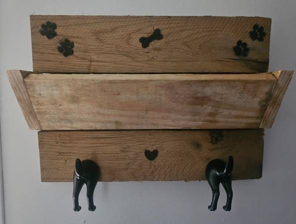 Made from old palletwood, this leash holder will never have you guessing where your pets leash is. Makes a great conversation piece and practical gift. Your pets name can be added as well.