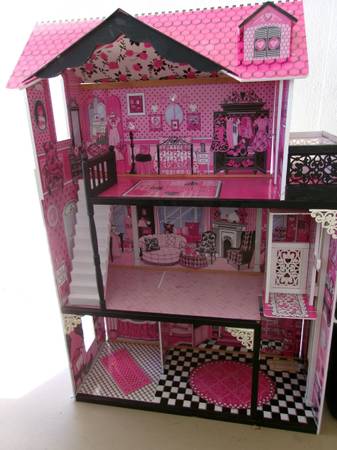 Kidcraft, three story, wooden dollhouse. This is an older model but still in overall great condition. A great piece and could be made into something really special for a little one for the holidays. The "wallpaper" inside is clean and free of rips or stains. The frame is a sturdy, wooden construction and then covered with the designs you see. Features multiple rooms, a moveable stairway and a moving elevator. Does not come with furniture or accessories but is a great starting point to make a really fun gift. Pet-free and smoke-free. Measures 48" tall, 323" wide and is 13" deep. $12. For more information, please contact me.