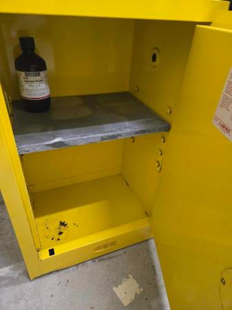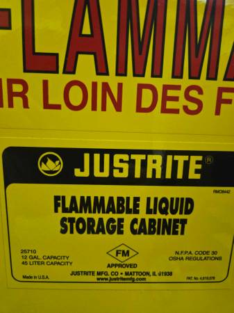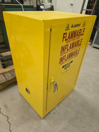 Justrite Flammables Cabinet Model 25710 Stay legal with flammables storage. 12 gallon/45 liter cabinet. Small rust spot inside (in pic). 2 keys $840 new price on Uline Location is Blaikie Ct Call or...