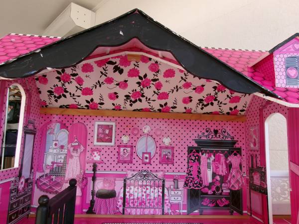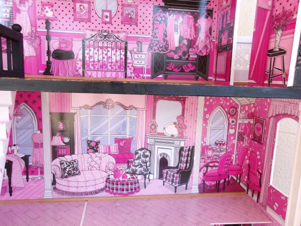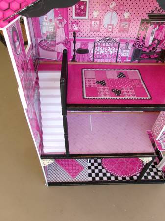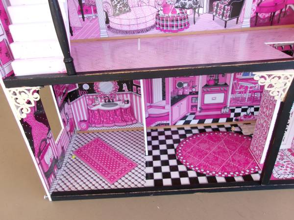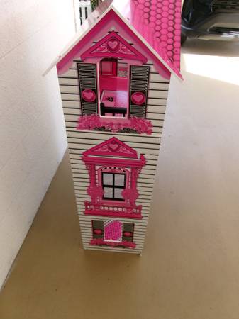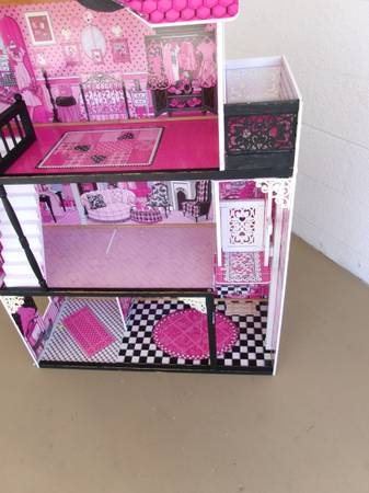 Kidcraft, three story, wooden dollhouse. This is an older model but still in overall great condition. A great piece and could be made into something really special for a little one for the holidays. The "wallpaper" inside is clean and free of rips or stains. The frame is a sturdy, wooden construction and then covered with the designs you see. Features multiple rooms, a moveable stairway and a moving elevator. Does not come with furniture or accessories but is a great starting point to make a really fun gift. Pet-free and smoke-free. Measures 48" tall, 323" wide and is 13" deep. $12. For more information, please contact me.
