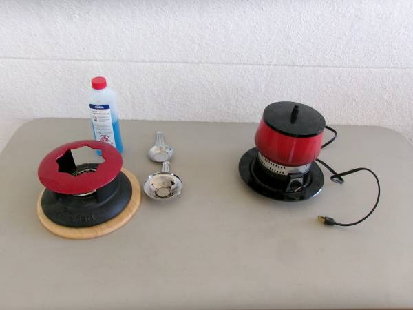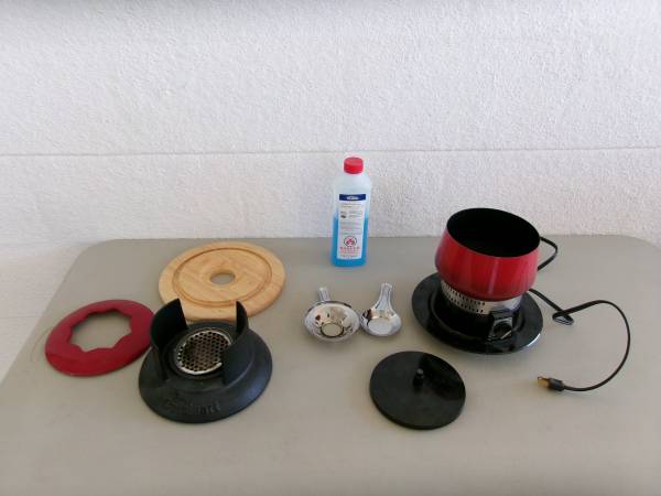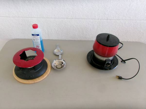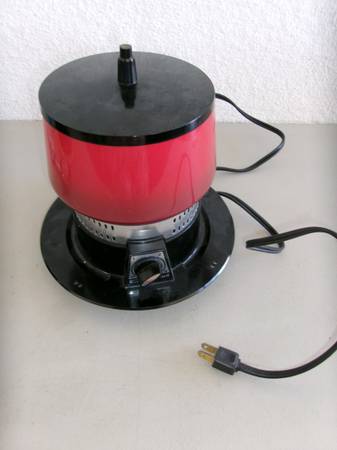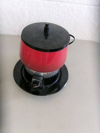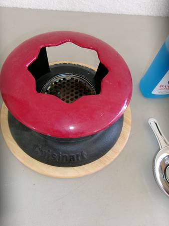 *Cuisinart Fondue pot w/base and top. This is a mid-century, black cast iron pot with red top to hold forks. Works with a lighting liquid so that it burns from underneath like a chafing dish. Comes with liquid.