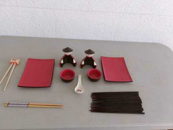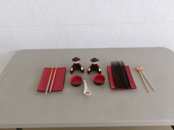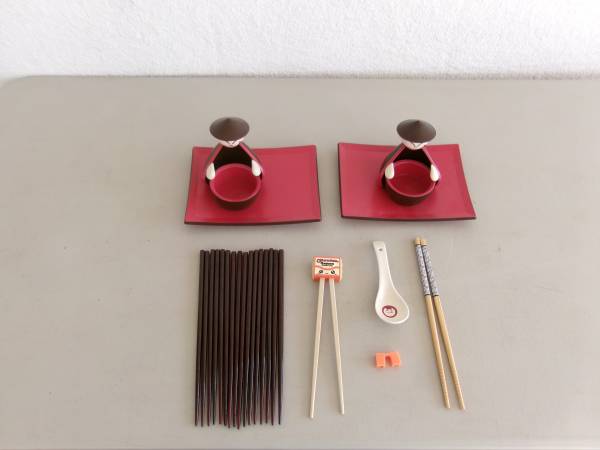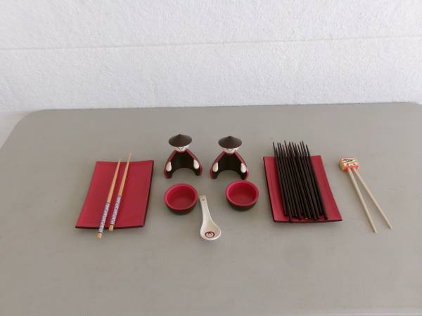 Super cute, Joie, sushi men set w/18 new, wood chop sticks. All items are in like new condition, older pieces that were never used. A really cute and fun set for children or adults. The set is red and brown melamine plastic, very strong and durable. The red tray/plates are the same material. Set consists of two men that each hold a bowl for rice or seasonings and then can be set on or off the tray. All pieces are individual and not connected to each other for easy washing up. This is an older set but stored and unused. Also included 16 new, brown wooden chopsticks, 1 pair natural wood with design and 1 set by Maruchan Ramen for children along with 1 ceramic soup spoon. A really nice set for someone who enjoys sushi. $10 for all. For more information, please contact me.