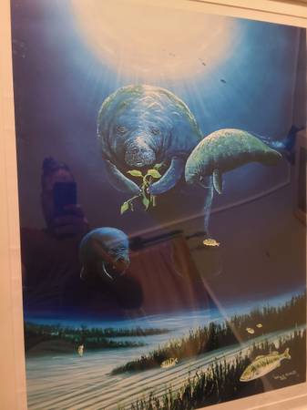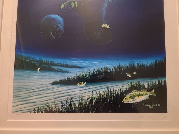 Estimated value is over $1800 directly from Wyland galleries. Frame is basic white wood matted and has been double signed by the artist. This is the heart of Florida, showing our water ways and beautiful playful Manatee friends.