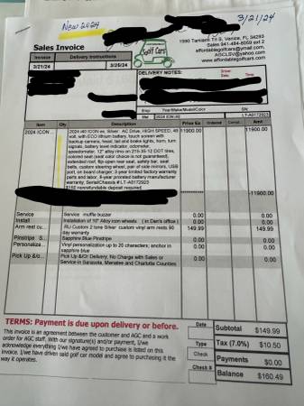Selling our 2024 ICON i40 golf cart, in mint condition with just 44 miles on the odometer. We purchased it brand new for $11,900 (receipt included in photos), but simply haven’t used it enough to justify keeping it.