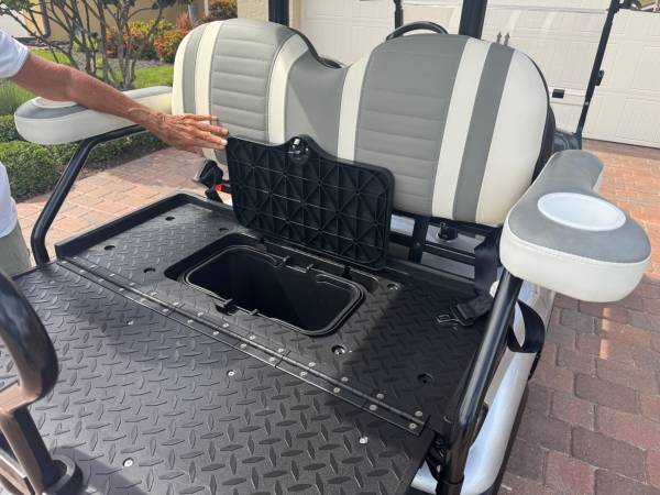 Comfort and convenience features include custom vinyl seats, a flip-open rear seat with built-in armrests and cup holders, and an extended roof that provides full shade coverage. It also comes with a custom steering wheel, seat belts, a safety bar, and a pair of side mirrors for added security. A USB charging port and on-board charger make powering up easy whether you’re at home or on the go.