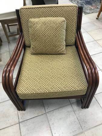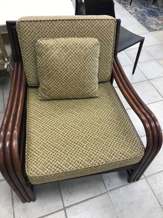 Coastal Side Chair - Brown wood outlines this great side chair which has a Bentwood style look. The fabric is a beautiful bamboo woven type print in green and cream. There are two of these chairs and each sell for 285.00 each.