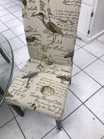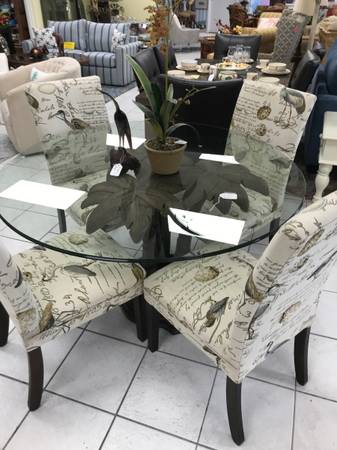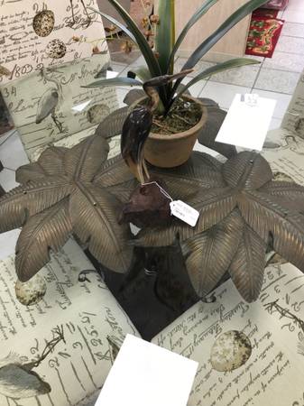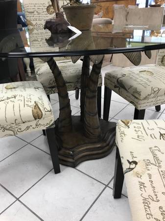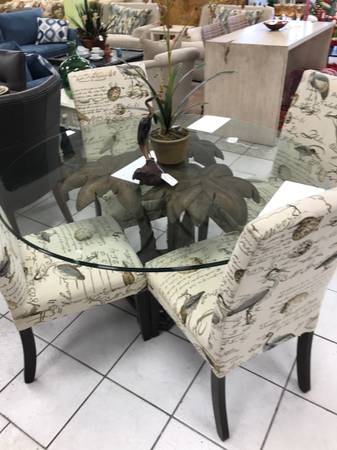 Glass Dining Table with a Palm tree base & 4 Coastal Chairs - Palm Base with a 54 in glass top. The Chairs are cream with coastal bird accents. Great conversation piece