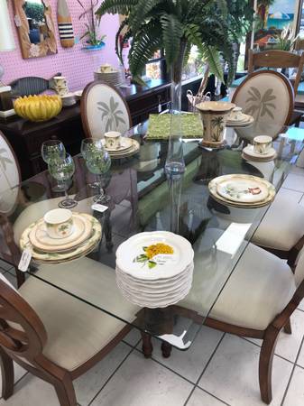 Glass Top Palm Tree Table and 6 Chairs - Beautiful wood carved palm tree base with a 42x72 inch glass top. There 6 wood chairs accented with palm tree print fabric.