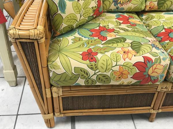 Rattan Sofa with a Colorful Coastal Print - Unique rattan accents this coastal sofa. The sofa has a colorful print of greens, blues, corals and yellow. Just stunning!
