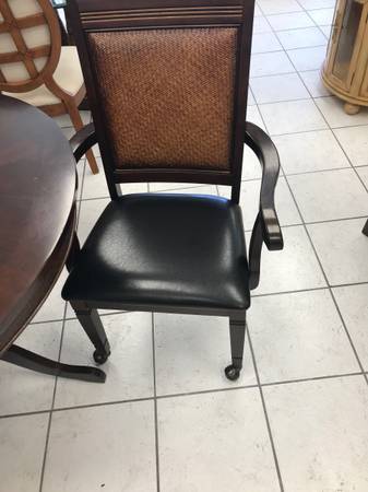 Round Wood Table and 3 Chairs on Coasters - This is a Dark round table measuring 46 inches . The chairs have rattan backing and black leather seats with coasters.