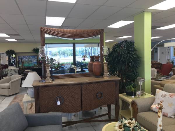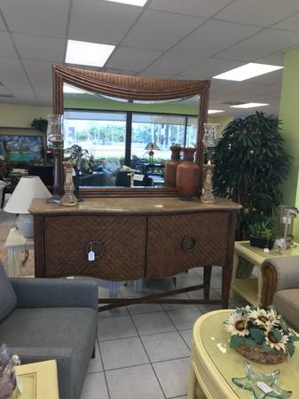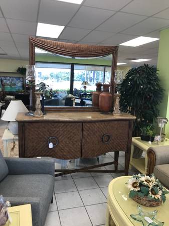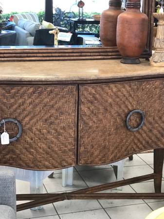 Sale - GRAB THIS GORGEOUS PIECE FOR THE HOLIDAYS ----Marble Top Tommy Bahama Style Grand Buffet with Mirror - Stunning Buffet with a marble top and rattan accents very Tommy Bahama style. The front has two grand doors with unique handles. This is a two piece item. Perfect for a your Florida home.
