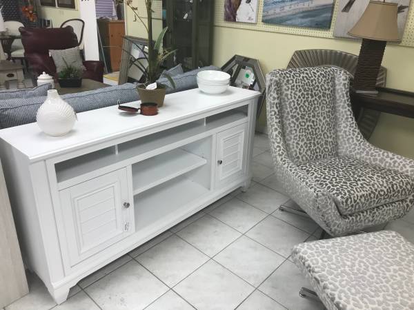 White Media Console - White Media console with two shutter style doors. This piece has plenty of areas for storing your media accessories. It measures 66x17x33