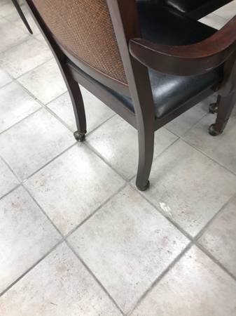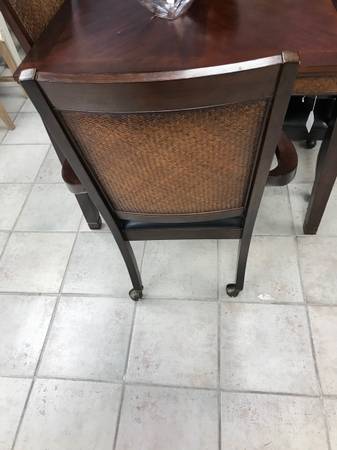 Wood Dining Table with 6 Chairs - Wood table accented with rattan. The chairs are also accented with rattan and have coasters. The table measures 42x60
