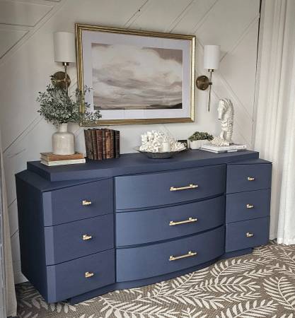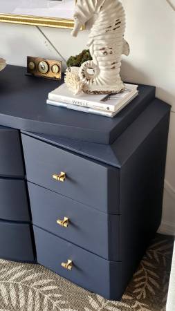 The head turning, big fender designs of the 1950's cars is mimicked in this amazing and super cool mid-century dresser. I took photos from all angles to show the unique shape. It's solid (and I do mean solid) wood and is sure to last for another several generations. I have restored over 1600 pieces of furniture, and this has to be the heaviest and most solid wood dresser I've ever worked on. The drawers are deep and tall and provide a ton of storage. A real conversation piece, this would be the focal point of any room and would make a perfect television anchor. It was refinished in a neutral Navy Blue and new brushed gold handles have been added.