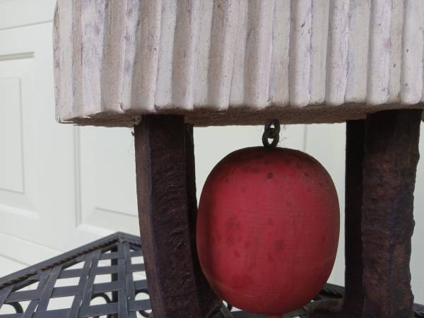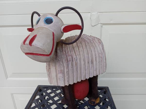 Rare matching pair of Americana folk art Sheep sculptures, wood and metal, legs made of rail spikes / nails, all complete with the large udder and all horns