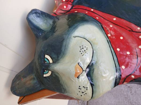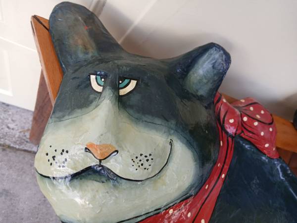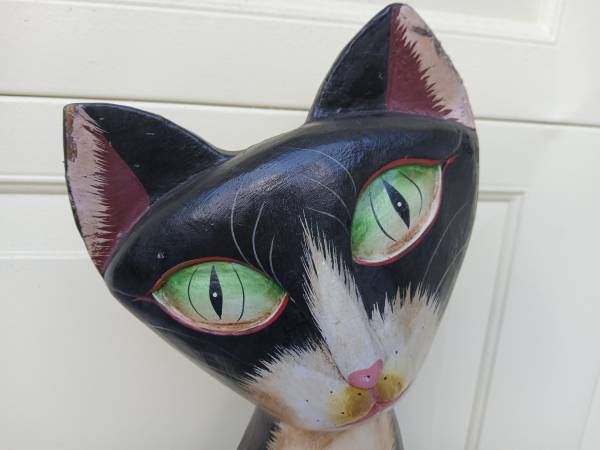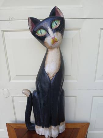 1. Lovely Large Vintage Hand Carved Indonesian Folk art Cat Statue, full of character, 31" high so stands out, 6" deep, 6" wide - $75