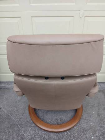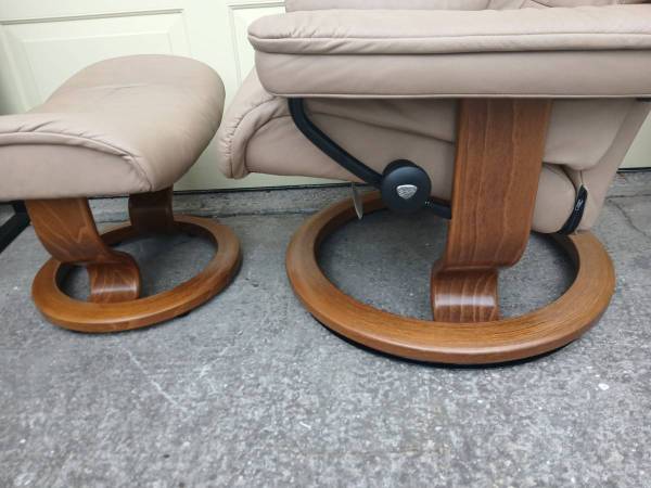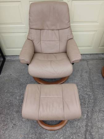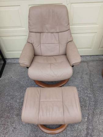 From Norway beautiful sought after Ekornes Stressless real leather recliner chair and matching ottoman/footstool in a Medium size so suitable for anyone and in top condition
