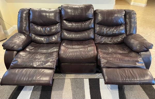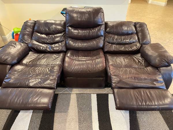 Leather recliner sofa. Dark brown, Three sections. 87” long. Two end sections recline with handles on sides. First-come, first-served