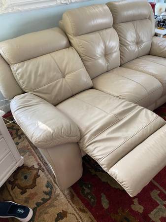 Leather couch. Off white. Three sections. 87” long. Two end sections recline with handles on sides. Mechanically sound No rips or tears.