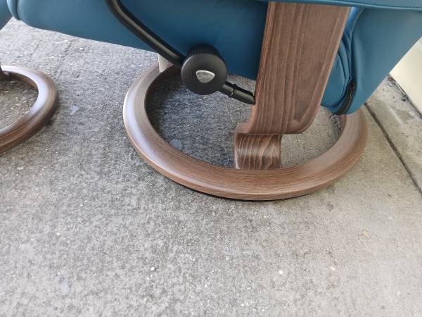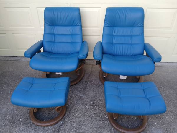 From Norway beautiful Ekornes Stressless leather recliner chairs and ottomans/footstools in as new condition, only a few months old, looks and feels like new, just beautiful, in a lovely blue teal color, will sell one for $1,595