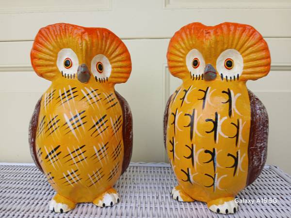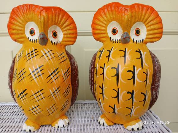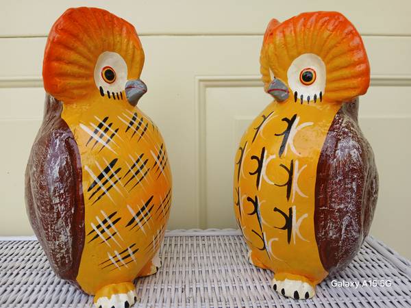 Great looking pair of large vintage hand painted owls, Folk Art Pottery, both in excellent condition