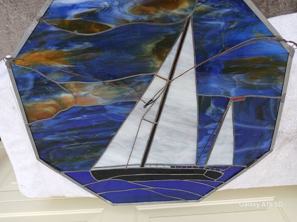 Beautiful Rare vintage large leaded stained glass sailing ship, measures 26" x 26" in excellent condition, ready to hang