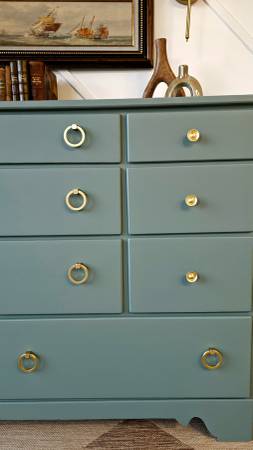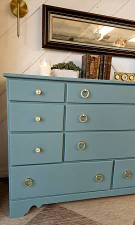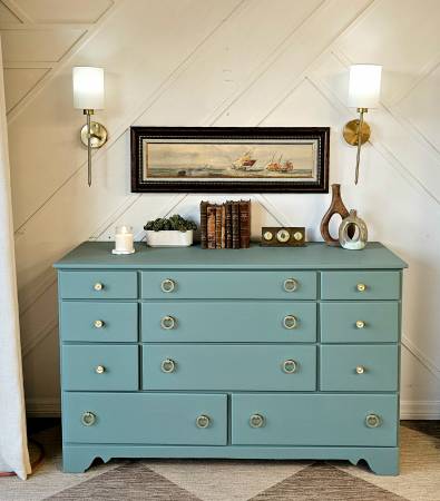 Who doesn't ❤️ vintage Ethan Allen? The heirloom quality of this sweet dresser is unsurpassed, and the use of small and large drawers is genius. This piece was renewed in a very trendy Botanical Green and features updated drawer pulls. The drawer glide like butter!
