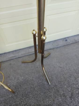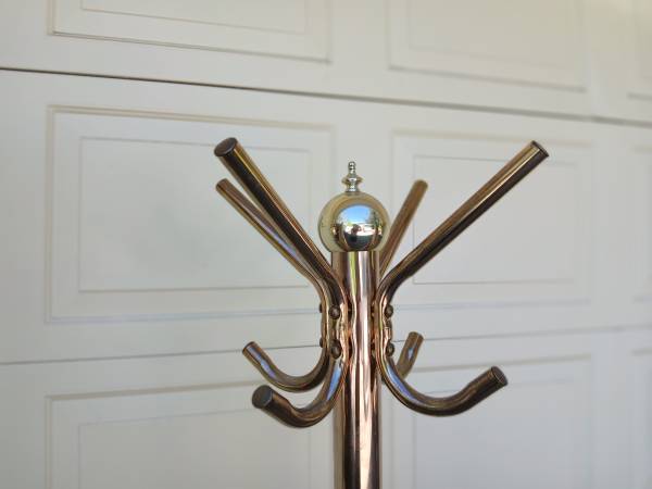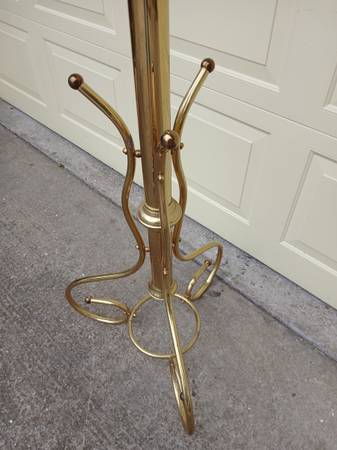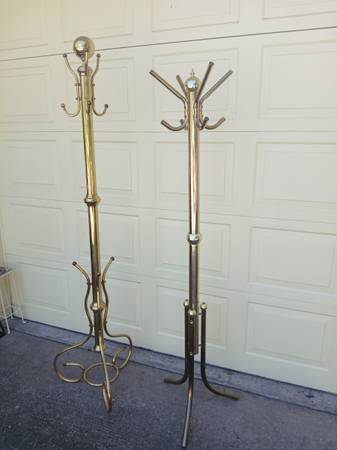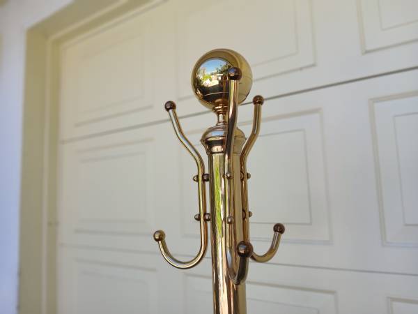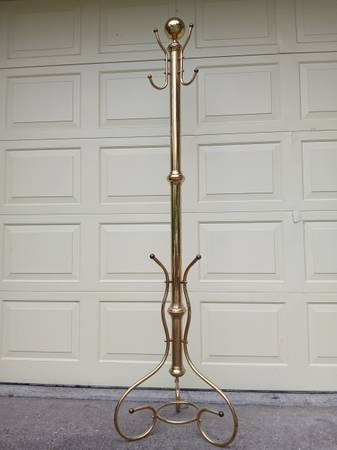 2. Vintage Hollywood Regency Brass Tone Metal Coat / Hall Tree Hat Rack Stand 68" high 18" wide at base. Has 8 hooks, 4 large and 4 small in an attractive antique brass finish For sale for $125 cash firm