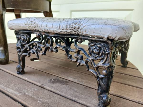 Lovely vintage ottoman /footstool in top condition, elaborate cast iron frame with faux leather crocodile or alligator skin pattern. 12" sq, 7" high
