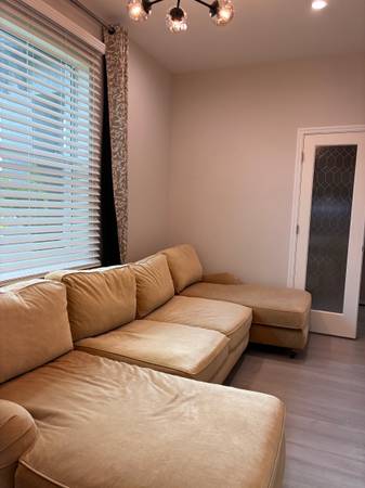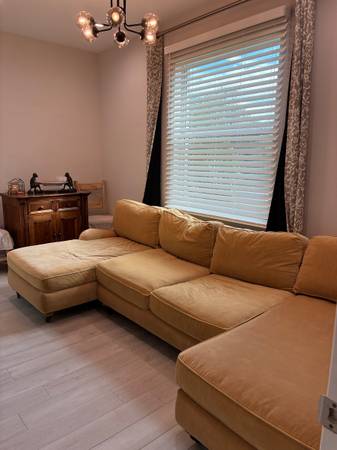 Restoration Hardware custom sectional sofa 3 piece with 2 end chaise. Down filled, Crushed velvet, color caramel. Clean and in good condition. No rips, stains or tears. Measures 127” long, 29” high,...