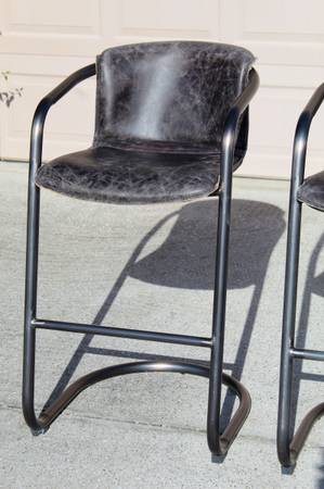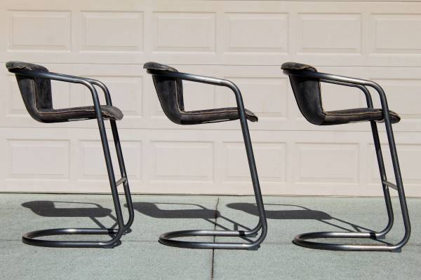 Set of 3 Leather Bar Stools – Industrial Style – (Value $1,500) Premium set from Home Trends & Design Top-grain distressed leather seats with strong iron frames and swoop arms. Super...