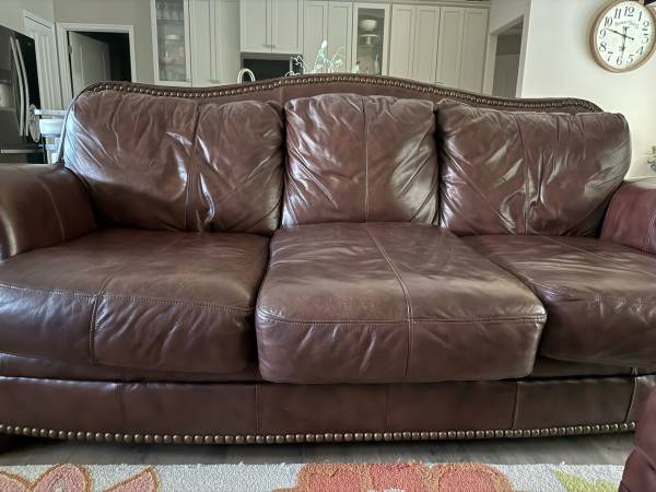 Couch, loveseat, chair and foot stool. Very comfortable soft brown leather with ‘bun’ wood feet. Nice stylish look.
