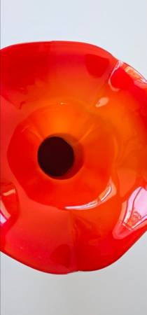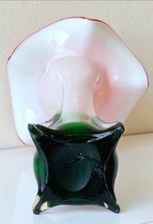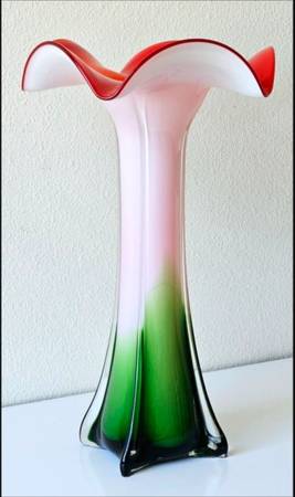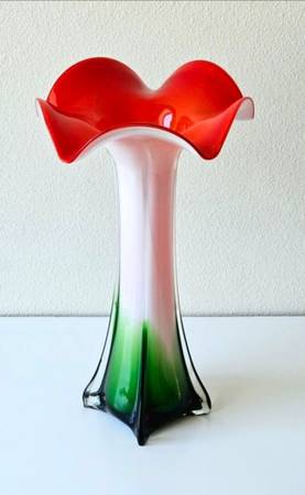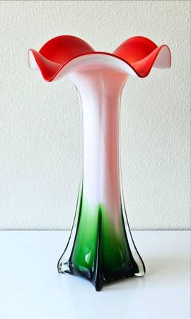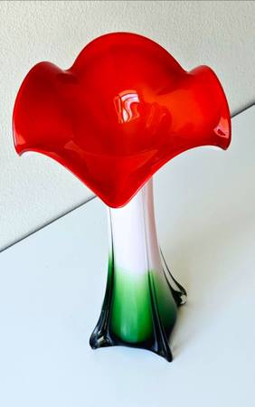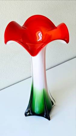 Add a touch of elegance to your space with this gorgeous vintage Italian art glass vase! Hand-blown with exquisite craftsmanship, it features a unique flower-shaped design that beautifully resembles a calla lily or tulip.