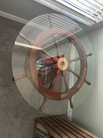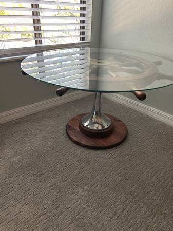 36” Nautical sailboat wooded wheel, Crome base, thick glass top