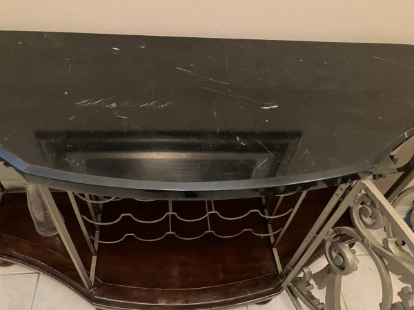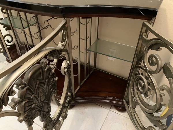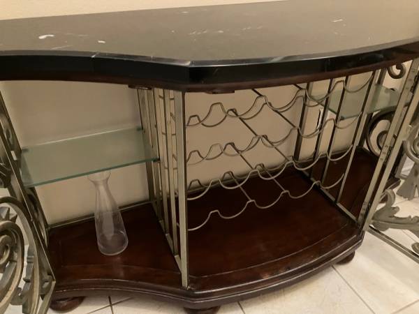 Elegant granite top Mediterranean style wine bar with gold rod iron doors that reveal compartments holds 20 bottles of your choice high-quality very heavy hardwood construction, beautiful granite...
