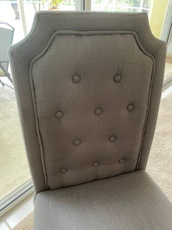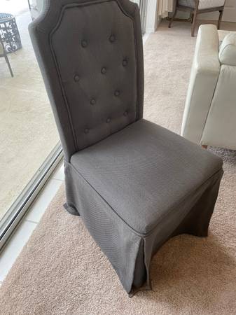 Our elegant rustic beige/dark grey dining side chairs are as functional as they are fashionable. Featuring a lush linen upholstery with button-tufted backrests and skirted design, these side chairs are great for family dinners or entertaining guests. Available in a set of 2. Available as dining sets.