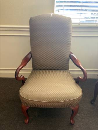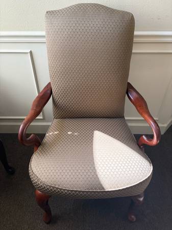 Pair of Upholstered Armchairs (Traditional, Tan Fabric) Matching pair of traditional upholstered armchairs with Queen Anne–style legs. Very comfortable and perfect for a waiting room or sitting...