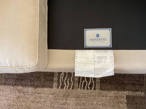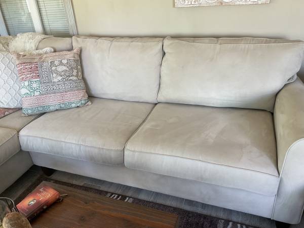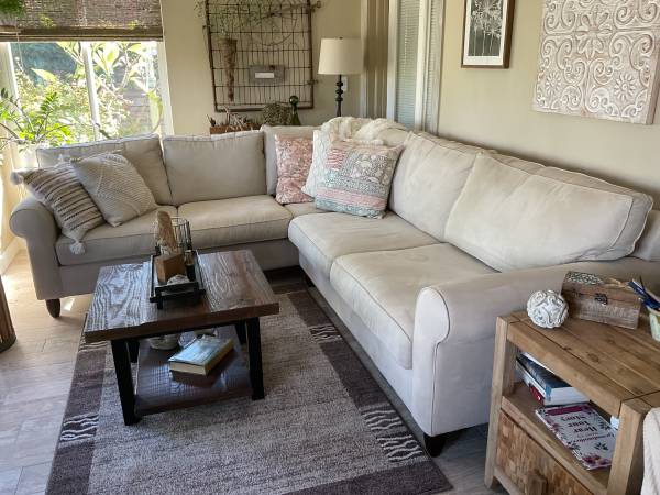Neutral biege sectional sofa originally purchased from Haverty's. One owner lighly used. Clean and in good condition. Measures 9 ft by 8ft. Cash only. Will need to pick up.