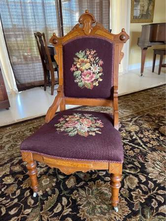 Antique 19th Century Renaissance Revival Burl Walnut Floral Needlepoint Side Chair. Similar chairs are selling between $800-$1000 as shown. Solid walnut with Burl walnut inlays and lovely carvings. Floral needlepoint upholstery and original porcelain casters. The chair measures 21 inches wide 20 inches deep and 39.5 inches tall at the back. Seat height is 16 inches.