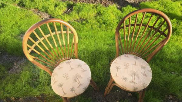 Two Bahama style dining chairs in very good condition. Sturdy, natural rattan pole framing with beautiful fabric design on the seats. Make these part of your living space and enjoy them for years to come. Sell new in the $175-$200 range. Serious buyers please.