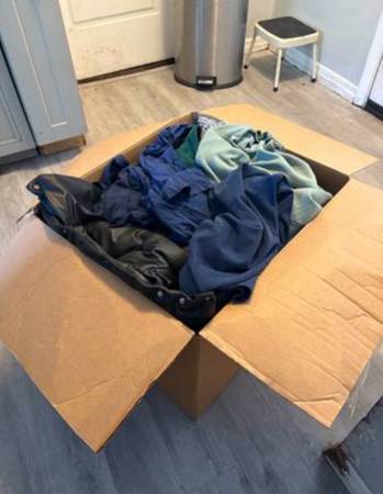 Giant box of clothing for sale (bigger than it seems it the picture). Lots of really nice items, for someone who has time to sell clothes. Plenty of XL, some L, M, S as well.