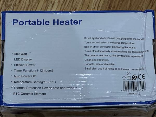 Portable heater, new in box. Have 3 available. - 500 watt - LED display - Timer function - Auto power off - Thermal protection - PTC Ceramic Element