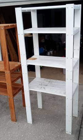 Includes "4-Shelf Wooden Shelving Unit x2 - Garage or Shed." Condition: Good; could use fresh paint; refer to the photos Overall approximate dimensions: - 18" x 36" x 62" - 18" x 29" x70" Price is...