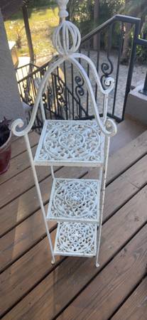 Vtg wrought iron and cast iron three tiered plant stand Does have some rusting but it’s still nice looking and serves its purpose Painted white Nice antique can be used indoors or outdoors