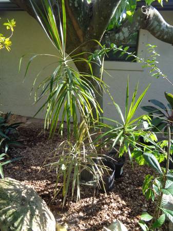 Dracaena is a popular plant with long, slender green leaves edged with red. These plants are drought tolerant and not at all fussy about their light conditions. This tree can grow up to 20 feet tall outdoors.