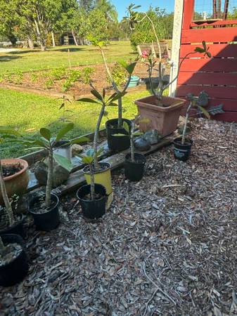 Plumeria started and rooted in 1/2 gal pots. $7 ea. Larger pots $10. These were cuttings from mature, seed bearing plants. You will get seed pods as well. Pot luck on colors. We have yellows, whites, magenta and reds on the property. Come see the parent plants.