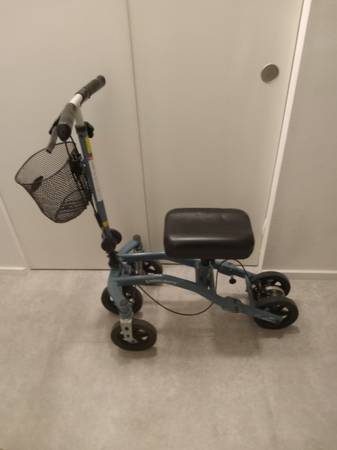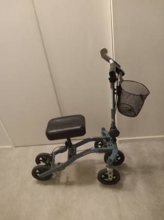 Maroon 4-wheel walker for sale with seat and brakes. $55. Aluminum walkers for sale $25. Black wheelchair for sale with footrest $125. Blue wheelchair for sale $45. Blue transport 4 wheelchair for...