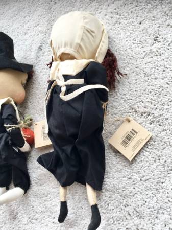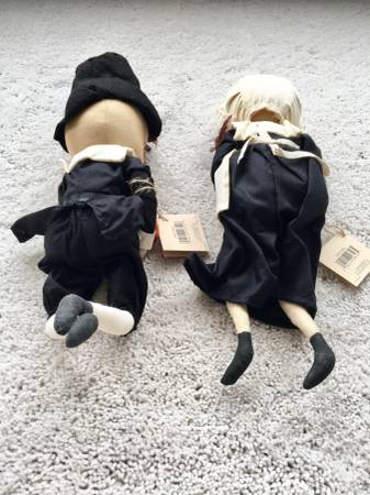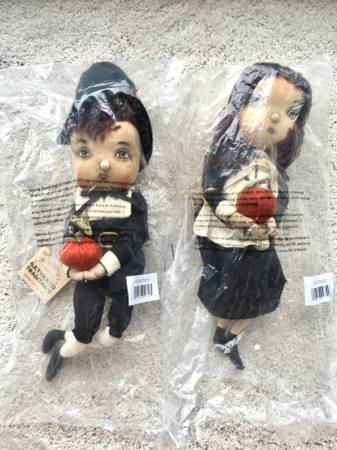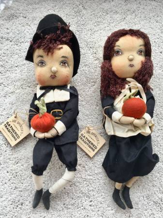 WTS: Joe Spencer’s Gathered Traditions Pilgrim Adam and Eve Shelf Sitters Thanksgiving Dolls.