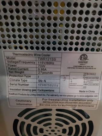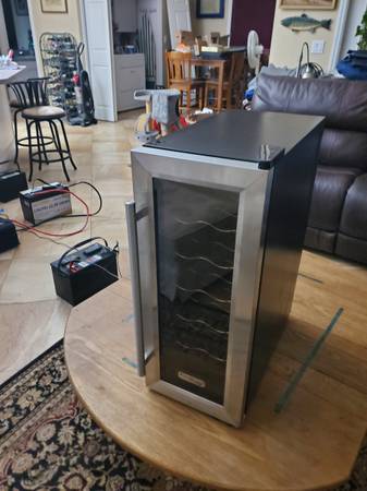 Kold front wine cooler holds 12 bottles, this is the new technology thermo electric cooling. It will take all day to bring it down to 56 degrees has an led light inside to illuminate the bottles....