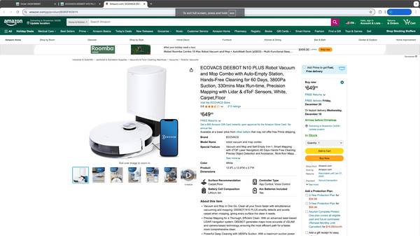 ECOVACS DEEBOT N10 PLUS Robot Vacuum and Mop Combo with Auto-Empty Station, Hands-Free Cleaning for 60 Days, 3800Pa Suction, 330mins Max Run-time, Precision Mapping with Lidar & dToF Sensors, White, Carpet,Floor Vacuum and Mop and Self Empty 3-in-1, Smart Mapping with dTOF Laser Navigation; 60 Days Hands Free Cleaning; Precise Object Detection and Avoidance;, Multi-floor Mapping; Editable Cleaning Home Map Including Area Cleaning, No-go Zone, No-mop Zone and Selective Room Cleaning; Auto-clean Scheduling; Auto Avoid Carpet When Mopping; Resumes cleaning where it left off after Auto-recharge; Alexa and Google Home Supported. Vacuum and Mop in One Go. Clean all your floors faster with simultaneous vacuuming and mopping. DEEBOT N10 PLUS smartly detects and avoids carpet when mopping, giving every surface the clean it needs. Precise Mapping for a Thorough, Efficient Clean. With an advanced laser-based LiDAR navigation system, DEEBOT generates maps more accurate of vSLAM and camera-based technology, ensuring the most efficient path for a faster, more comprehensive clean. Powerful Deep Cleaning with 3800Pa Suction. With a maximum suction power of 3800Pa, DEEBOT N10 PLUS easily lifts dirt, debris from crevices and carpet fibers. Powered by 5200mAh battery, it cleans up to 200mins (330mins on quiet mode) on a single charge. Months of Hands-free Cleaning. The Auto-Empty Station with 2.5L dustbag holds 2 months' worth of vacuum debris, staying maintenance free for 60 days. The auto-seal design of the dust bag keeps the mess contained when you are ready to discard. Breathe Easy. Say Goodbye to the Odor of Pet Hair. The specially designed dust bag and filter can easily filter particles and trap odors at the same time, absorbing the smelly substances produced by ordinary household wastes.